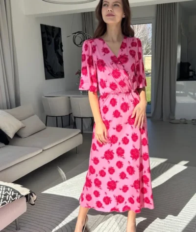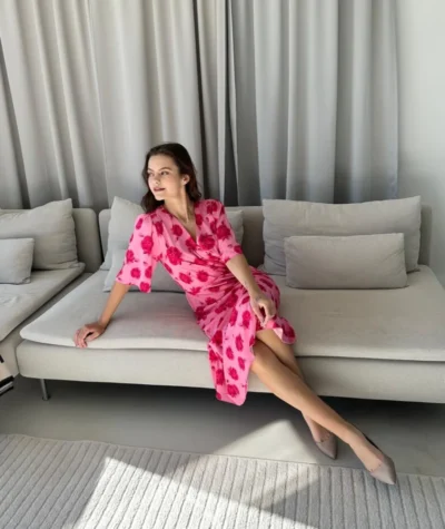 Postaw na kobiecość i nieprzemijający urok kwiatów! Ta wyjątkowa sukienka wykonana z lekkiej, wysokiej jakości wiskozy to idealne połączenie komfortu i elegancji. Jej intensywny różowy kolor przełamany głęboką czerwienią róż przyciąga wzrok i dodaje energii każdej stylizacji.