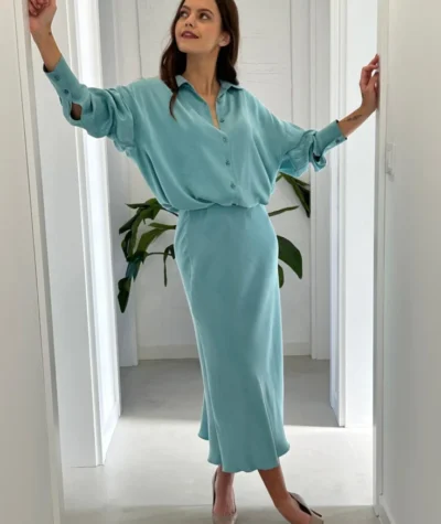 Odkryj siłę kobiecości w minimalistycznym wydaniu. Ta spódnica o długości midi to synonim klasy i ponadczasowego stylu. Wykonana z lejącej tkaniny o subtelnym, satynowym połysku, genialnie układa się na sylwetce, reagując na każdy Twój ruch. Jej odcień dodaje stylizacji szlachetności i świeżości.
