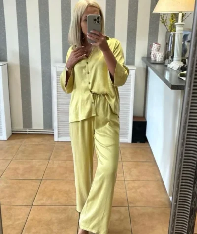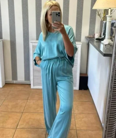 Poczuj niesamowitą lekkość i swobodę dzięki naszym spodniom o szerokim kroju. Wykonane z lejącego, subtelnie połyskującego materiału, stanowią idealną bazę do stylizacji typu quiet luxury. Ich kojący odcień doda świeżości Twojej garderobie i sprawi, że wyróżnisz się z tłumu.