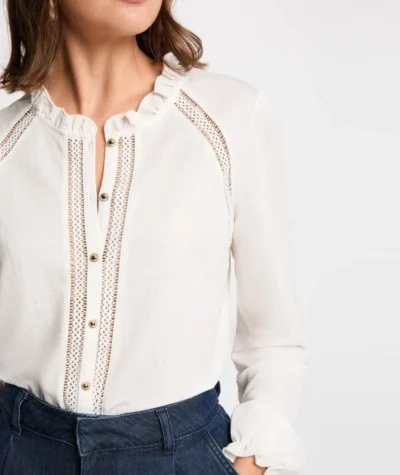 Ta prosta koszulka podkreśla każdą sylwetkę, zapewniając jej naturalną elegancję. Wysoki kołnierz dodaje jej kobiecego i wyrafinowanego charakteru, a eleganckie guziki stanowią subtelny, a zarazem efektowny detal. Falbany nadają jej subtelny, a zarazem nowoczesny charakter, nadając całości nowoczesny wygląd.