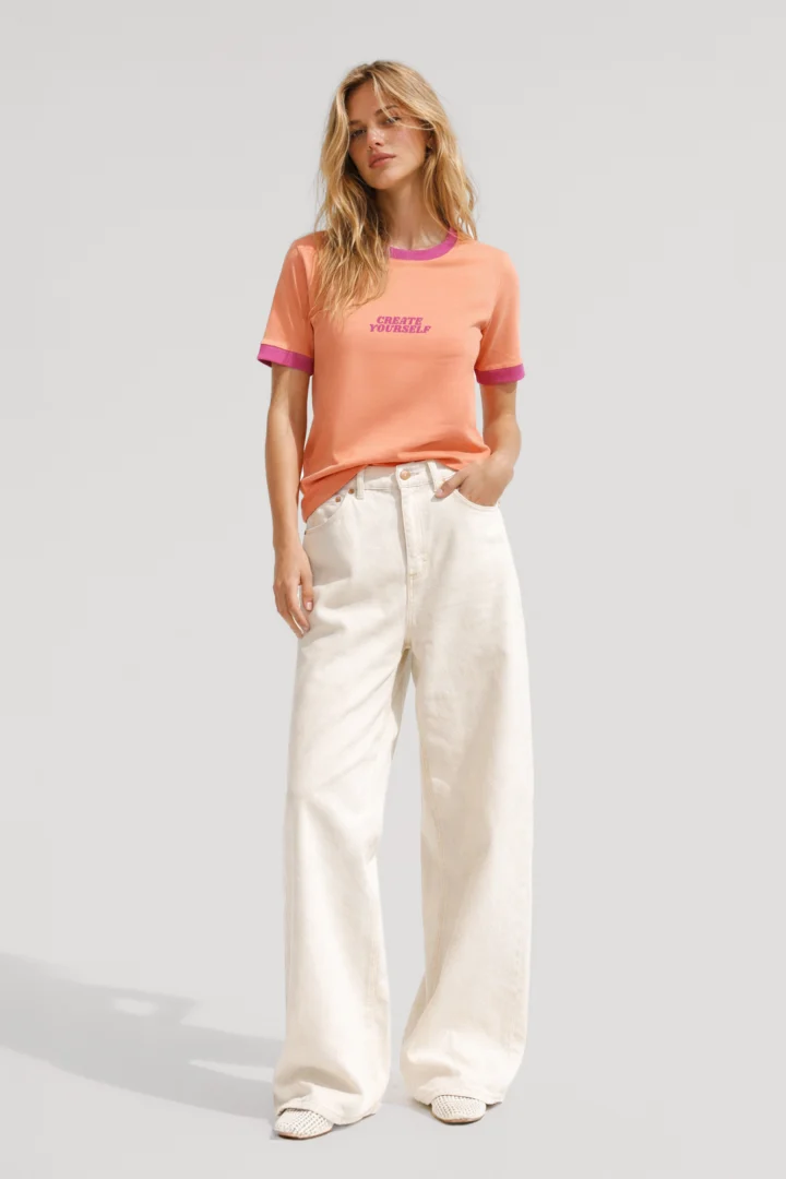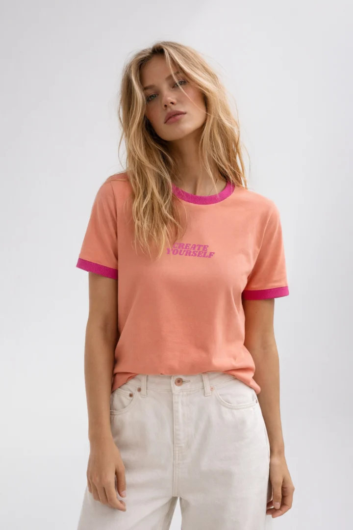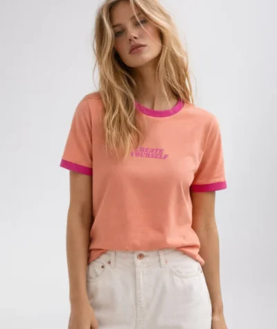 Koralowy damski t‑shirt z napisem „Create Yourself” i beżową lamówką łączy wygodę z modnym stylem.