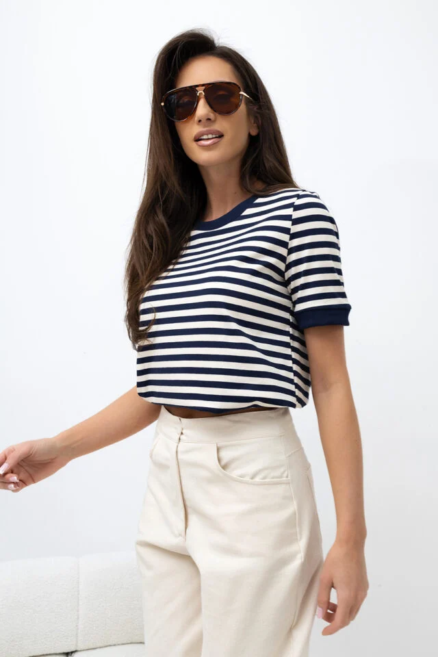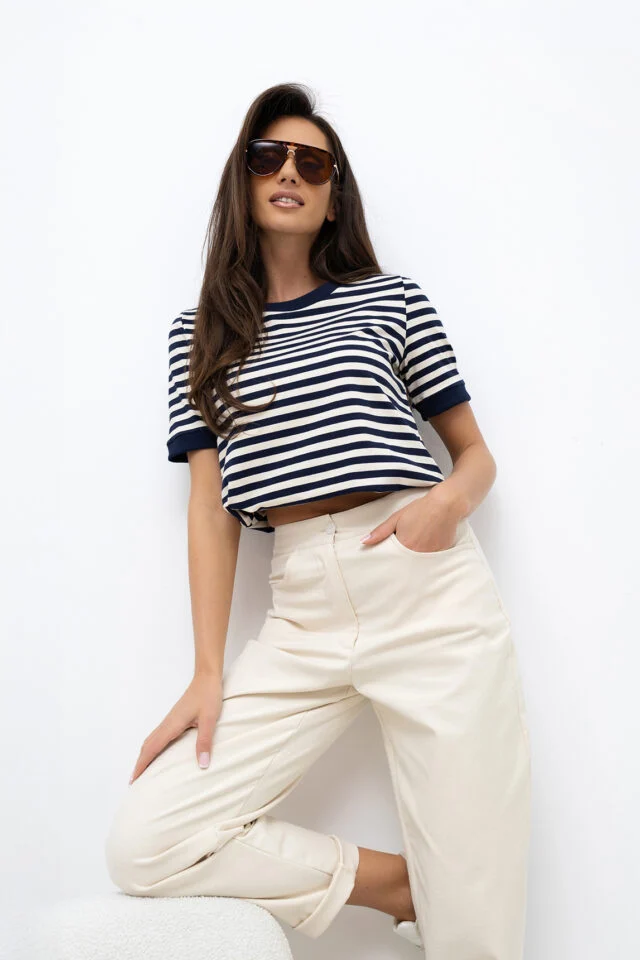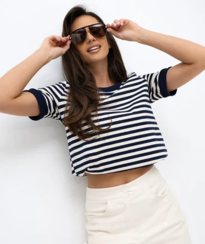 Krótki rękaw i klasyczny krój sprawiają, że koszulka świetnie sprawdzi się w codziennych, casualowych zestawach, a paski nadają stylizacji charakteru i nowoczesnego wyrazu.