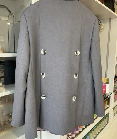 Elegancka szara marynarka o dopracowanym, nowoczesnym fasonie. Czysta linia przodu podkreśla jej luksusowy charakter, a subtelnym wyróżnikiem są ozdobne guziki z tyłu – po trzy z każdej strony. Wyrafinowany model idealny do stylowych, miejskich i eleganckich zestawów.