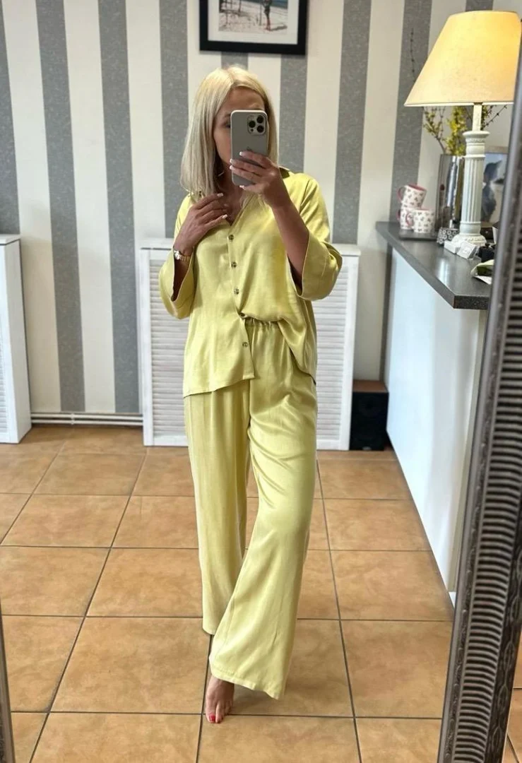 Poczuj niesamowitą lekkość i swobodę dzięki naszym spodniom o szerokim kroju. Wykonane z lejącego, subtelnie połyskującego materiału, stanowią idealną bazę do stylizacji typu quiet luxury. Ich kojący odcień doda świeżości Twojej garderobie i sprawi, że wyróżnisz się z tłumu.
