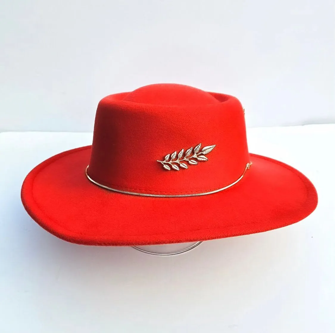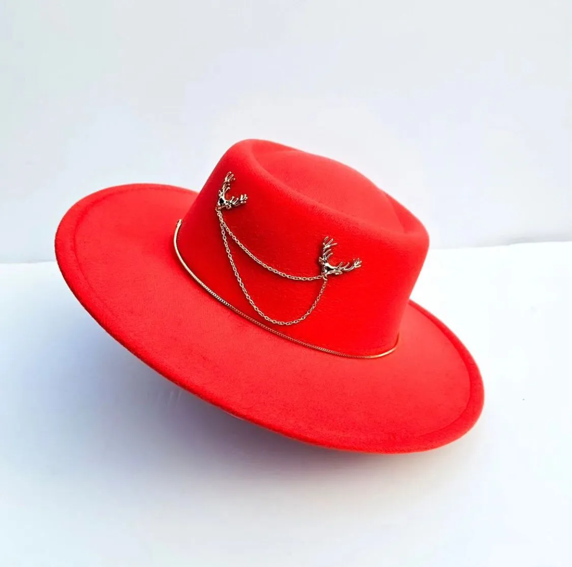 Piękny kapelusz w kolorze czerwonym z dodatkami. Ozdobiony został z dwóch stron aplikacjami oraz dookoła łańcuszkiem.