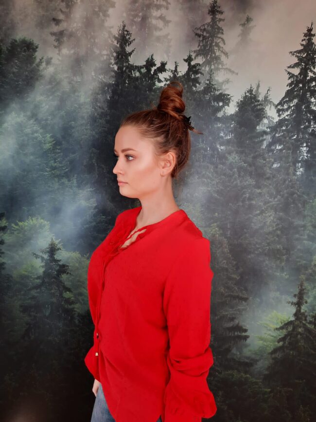 Kobieca bluzka w kolorze czerwonym. Uszyta z wiskozy, wiązana pod szyją.