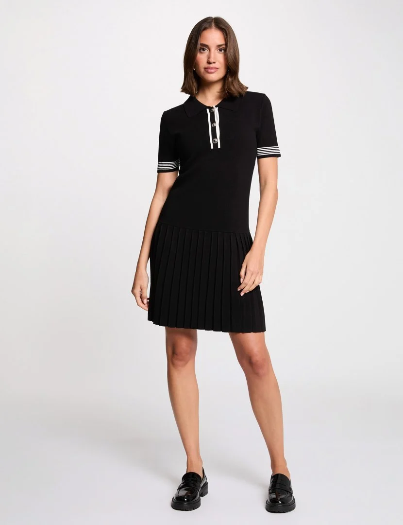 Ta krótka, zwiewna sukienka łączy kobiecość i nowoczesność dzięki delikatnym plisom. Dopasowany krój podkreśla talię, jednocześnie modelując sylwetkę. Kołnierzyk z wycięciem modeluje dekolt, nadając mu elegancki wygląd, a guziki dodają mu nieodparcie szykownego charakteru.