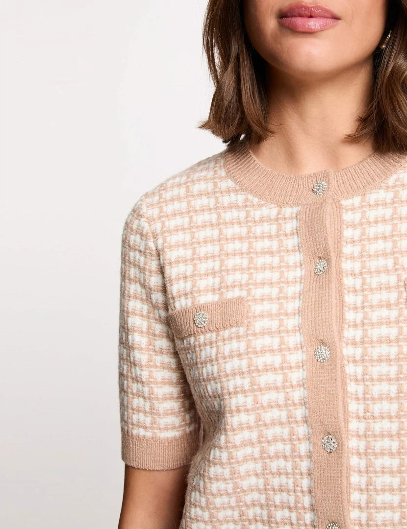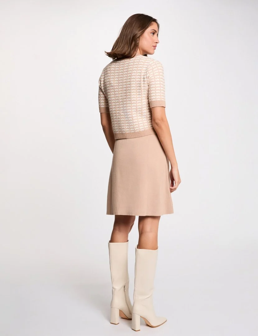 Ta krótka, dopasowana sukienka delikatnie podkreśla talię, nadając jej kobiecy wygląd. Efekt 2 w 1 dodaje jej nowoczesnego i wyrafinowanego charakteru, a wełniana faktura dodaje szyku i współczesnego uroku. Wyrafinowane guziki elegancko dopełniają całość.