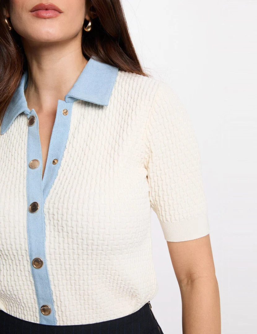 - Dżinsowe karczki przy dekolcie i zapięcie na guziki