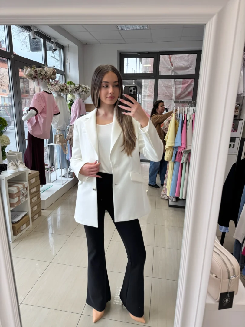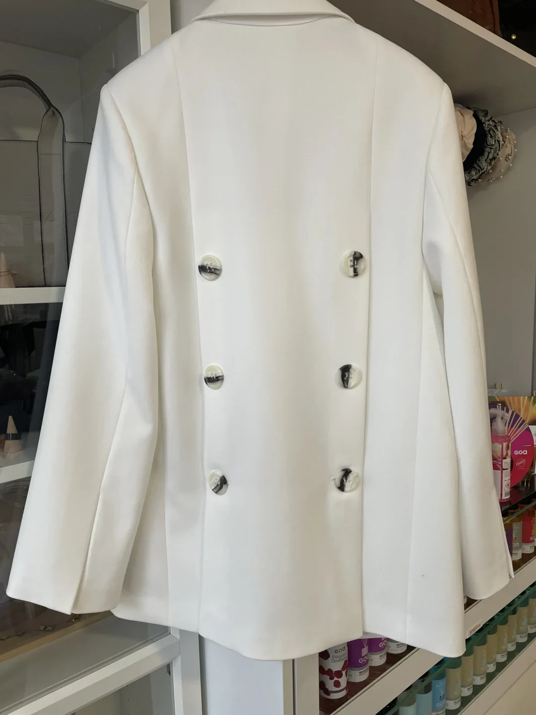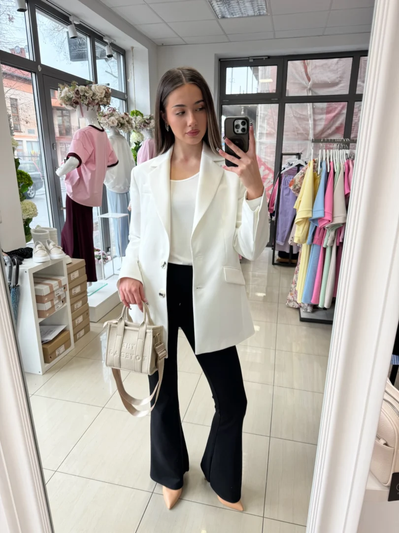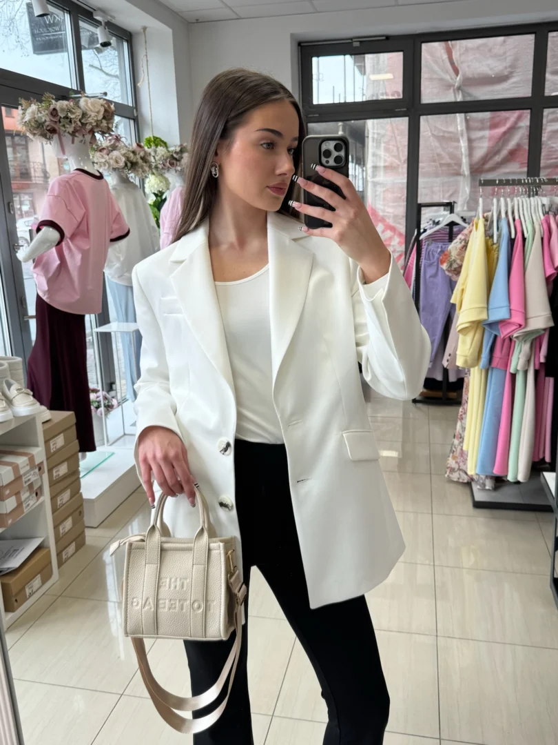 Elegancka biała marynarka o dopracowanym, nowoczesnym fasonie. Czysta linia przodu podkreśla jej luksusowy charakter, a subtelnym wyróżnikiem są ozdobne guziki z tyłu – po trzy z każdej strony. Wyrafinowany model idealny do stylowych, miejskich i eleganckich zestawów.