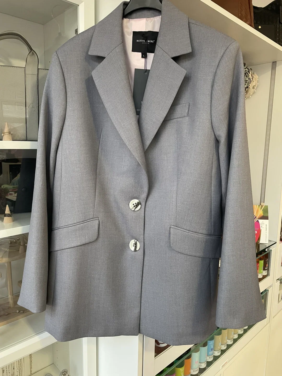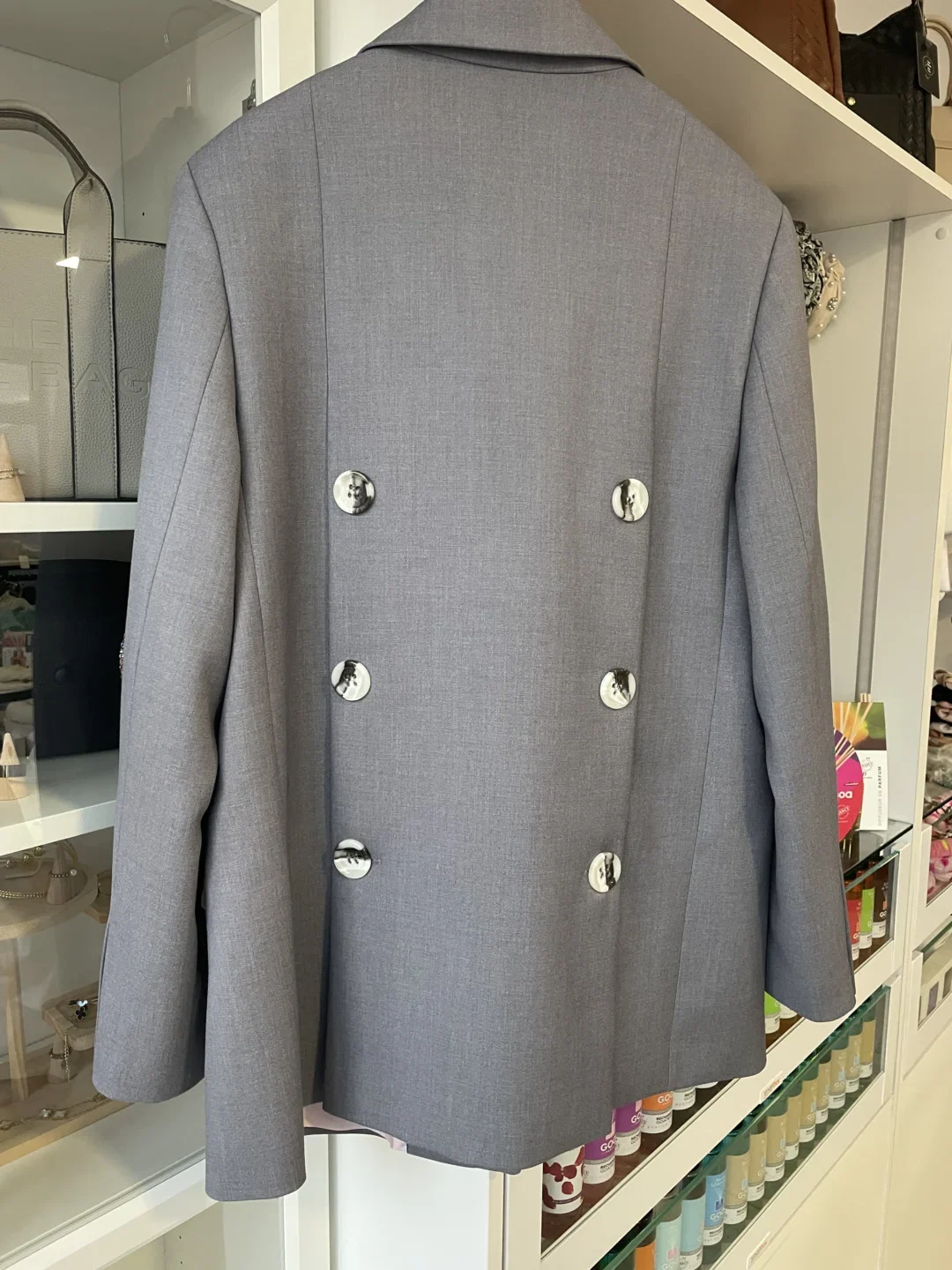 Elegancka szara marynarka o dopracowanym, nowoczesnym fasonie. Czysta linia przodu podkreśla jej luksusowy charakter, a subtelnym wyróżnikiem są ozdobne guziki z tyłu – po trzy z każdej strony. Wyrafinowany model idealny do stylowych, miejskich i eleganckich zestawów.