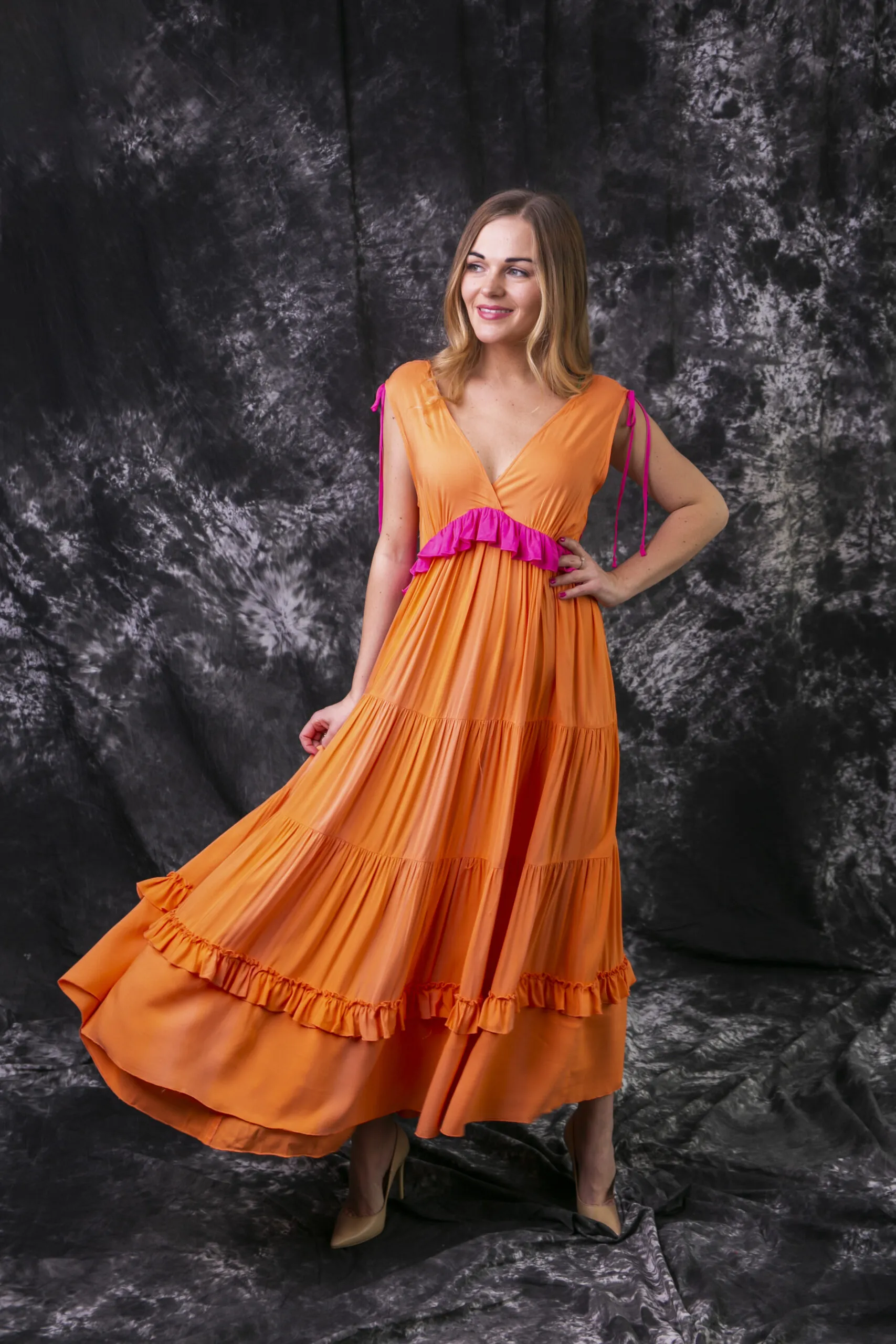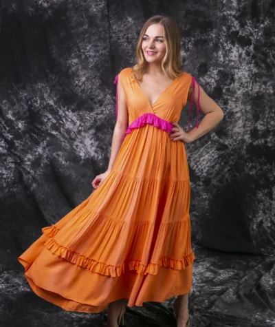 - sukienka w kolorze pomarańczowym z różowymi dodatkami