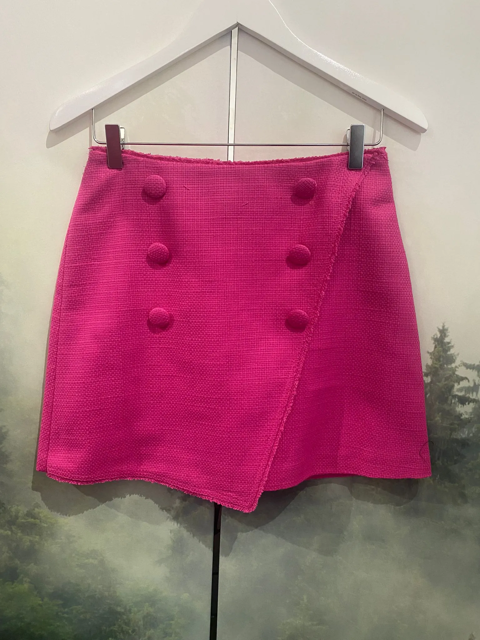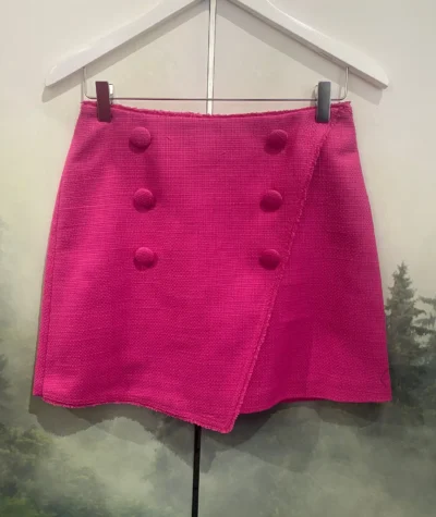 Krótkie spodenki z zakładką oraz podwyższonym stanem w kolorze różowym. Zapinane z tyłu na zamek błyskawiczny.