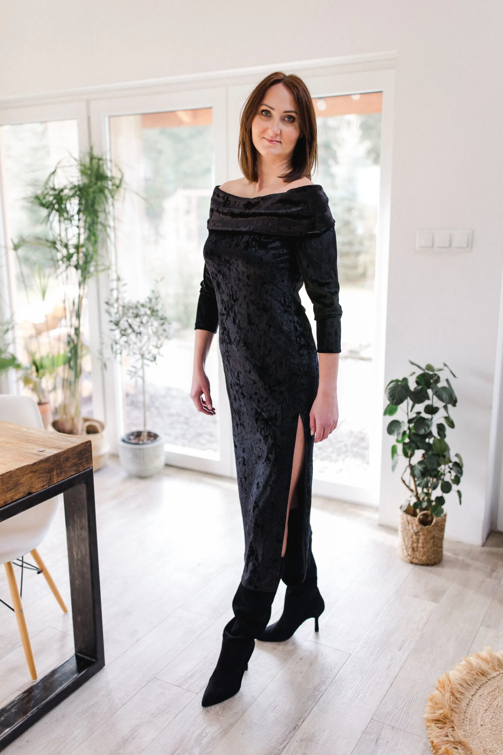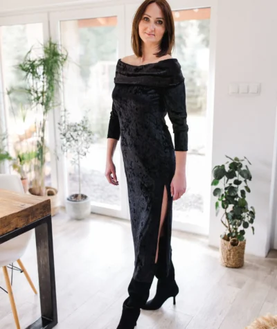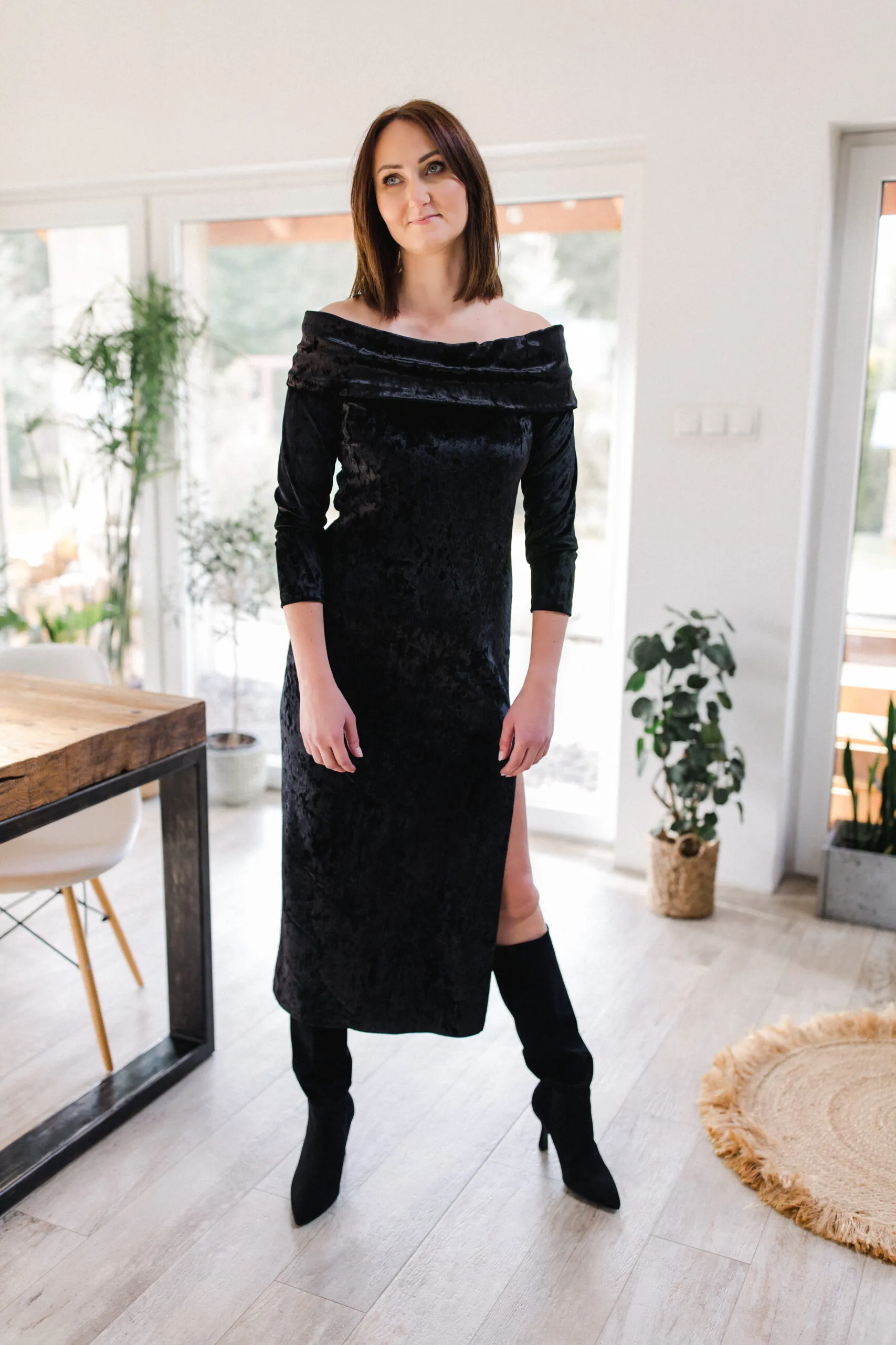 Cudna welurowa sukienka o długości midi. Sukienka o kroju hiszpanki. Możliwość opuszczenia sukienki z ramion lub podniesienie (dekolt na gumce). Kolor czarny.