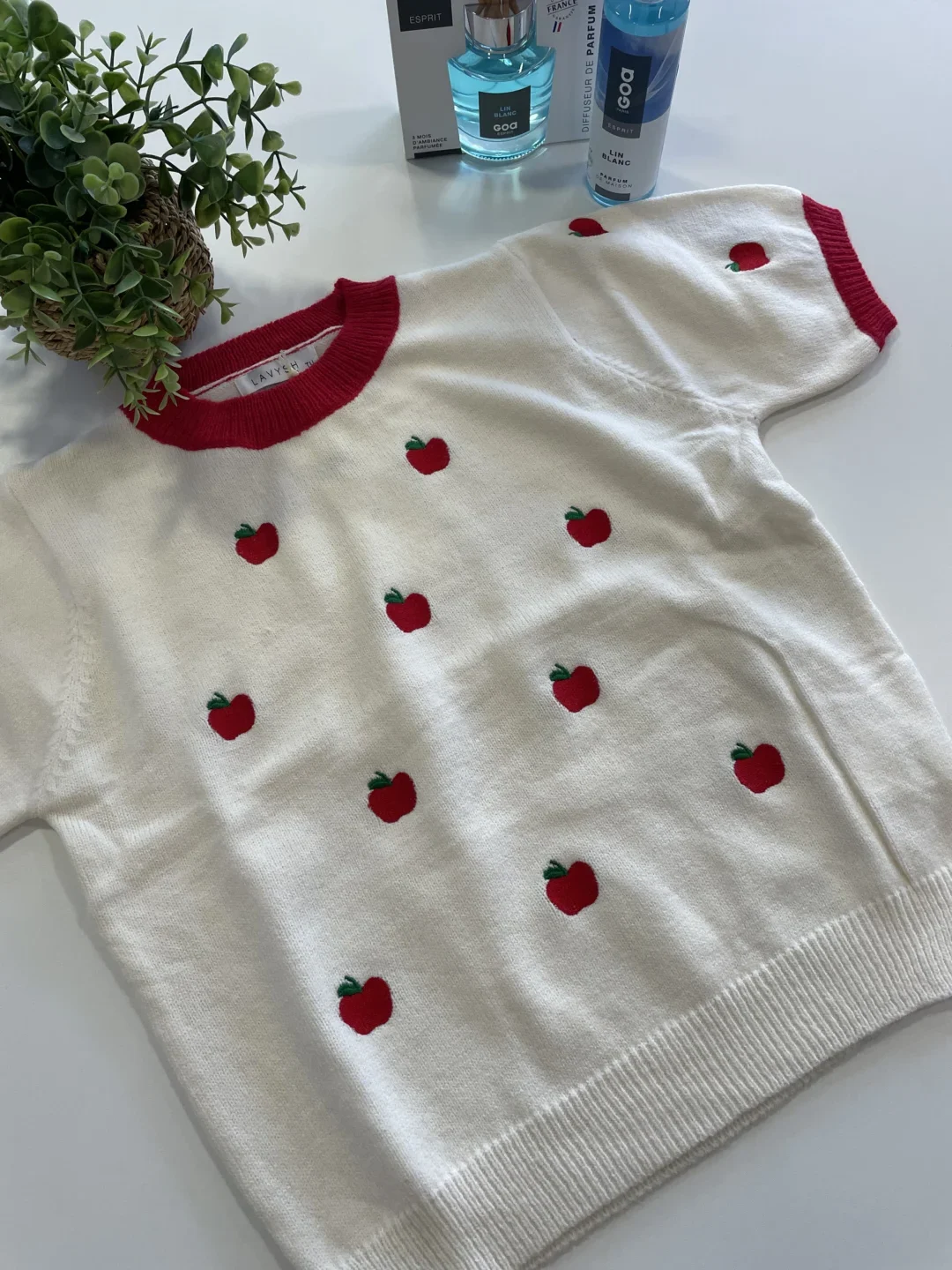 Lekki, wiosenny sweterek z krótkim rękawkiem ozdobiony uroczym motywem jabłek ???? To idealne połączenie świeżości i stylu – miękki, przyjemny w dotyku materiał sprawdzi się w cieplejsze dni, a owocowy wzór doda energii każdej stylizacji. Świetny wybór na wiosenne spacery i casualowe outfity.
