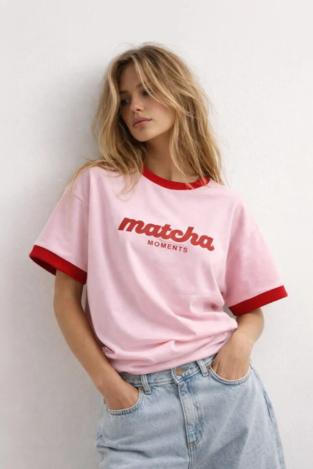 Jasnoróżowy T‑shirt Matcha Moments z czerwoną lamówką to lekki, wygodny i pełen młodzieżowego uroku model.