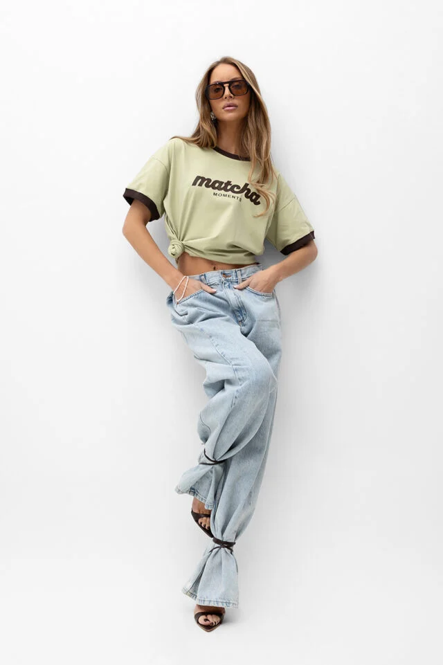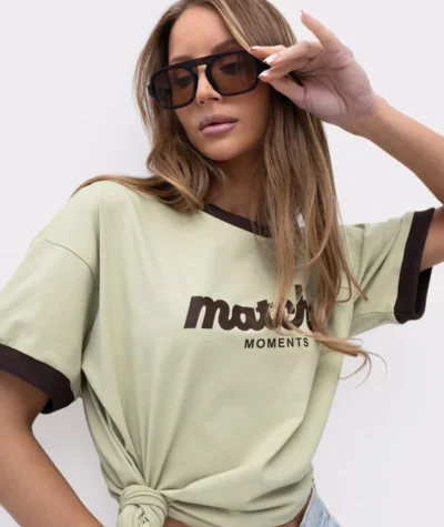 Jasnozielony T‑shirt Matcha Moments z brązową lamówką – lekki i wygodny, idealny do codziennych, młodzieżowych stylizacji.