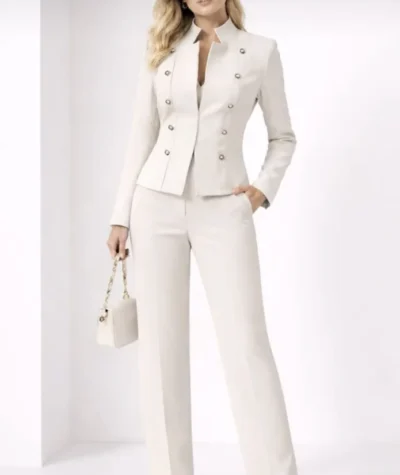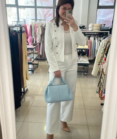 Ta prosta koszulka podkreśla każdą sylwetkę, zapewniając jej naturalną elegancję. Wysoki kołnierz dodaje jej kobiecego i wyrafinowanego charakteru, a eleganckie guziki stanowią subtelny, a zarazem efektowny detal. Falbany nadają jej subtelny, a zarazem nowoczesny charakter, nadając całości nowoczesny wygląd.