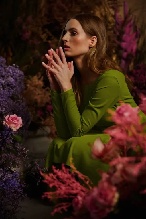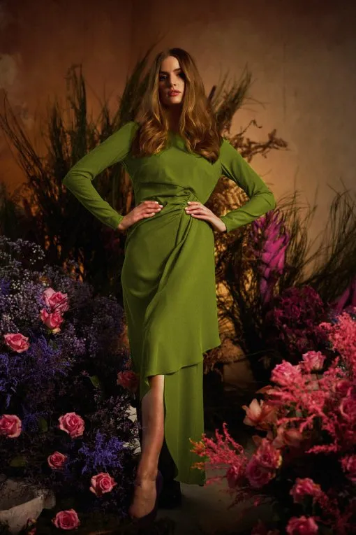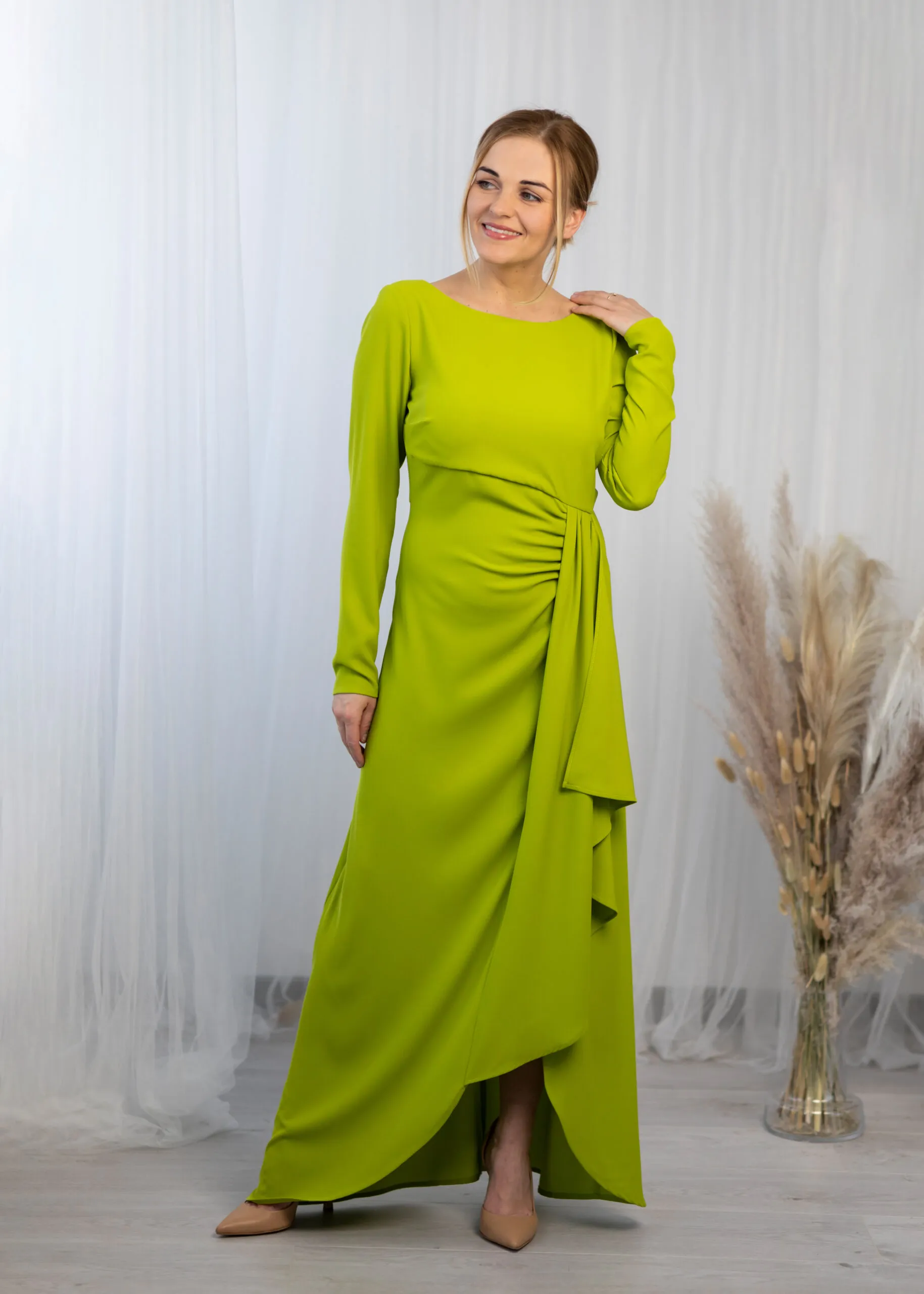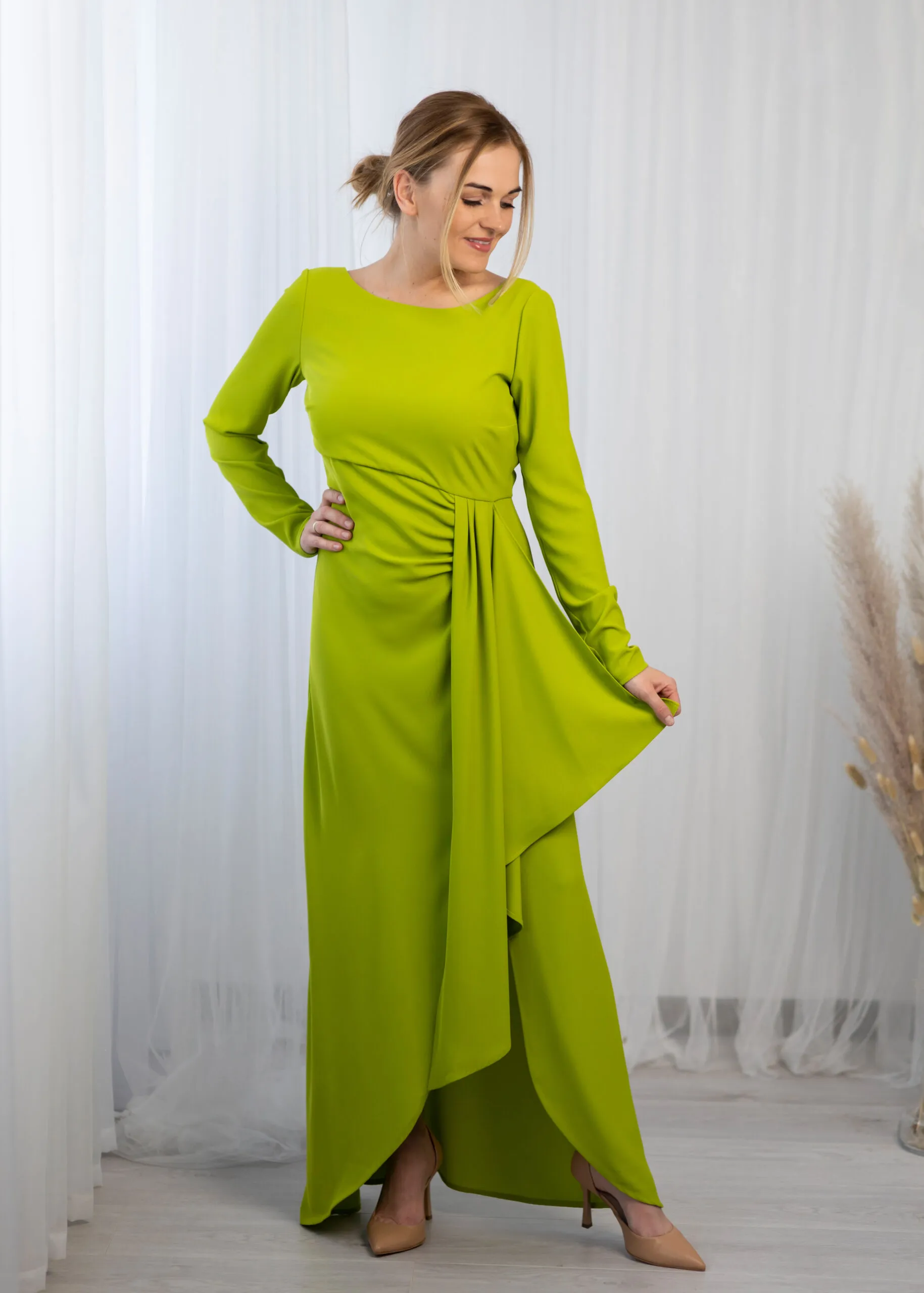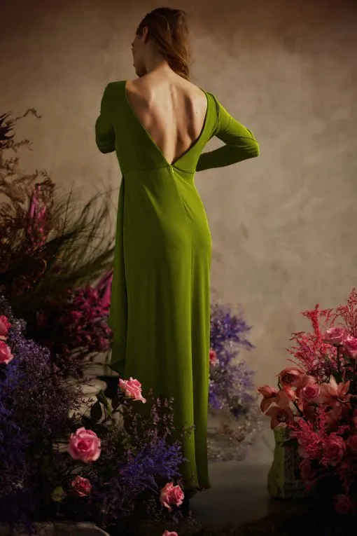Długa suknia z dekoltem na plecach w kolorze pięknej zieleni. Płytki dekolt w przodzie. Przód układany w zakładki z pęknięciem eksponującym nogę. Dół sukni zdobi zamaszysta falbana. Tył z głębokim wycięciem. Cała góra odszywana podwójnie. Długi wąski rękaw. Sukienka zapinana na zamek kryty.