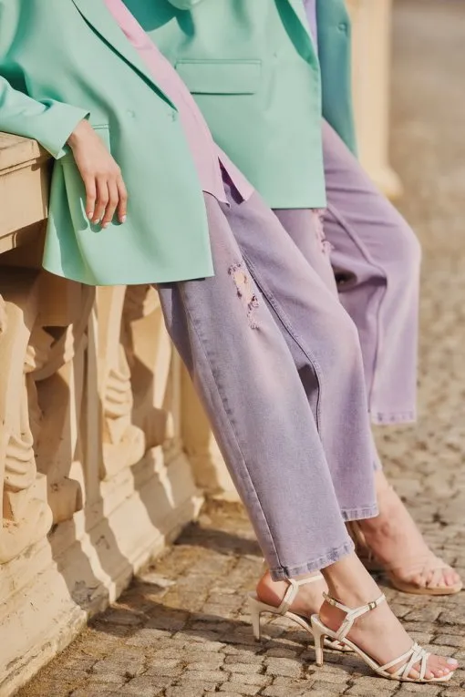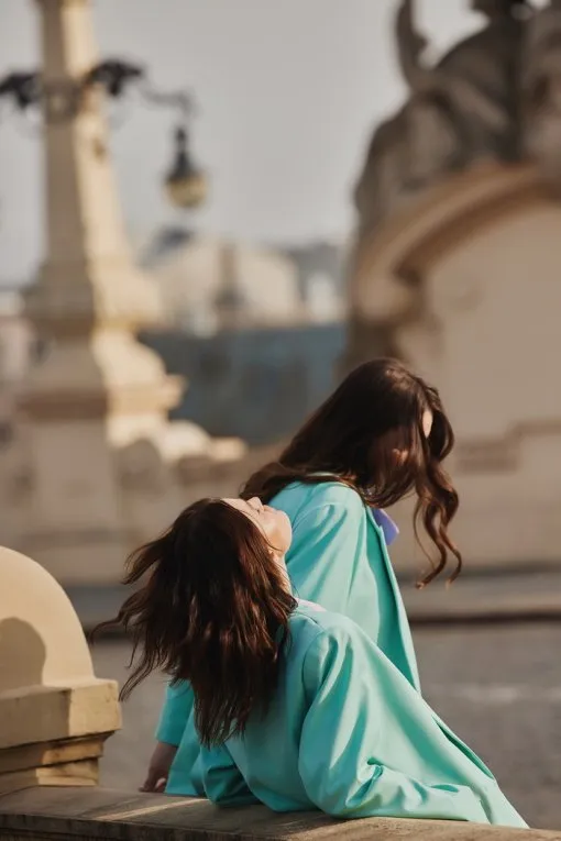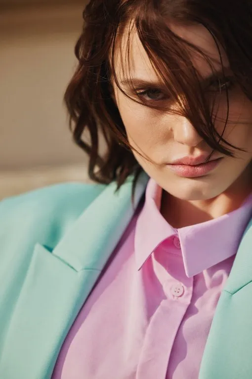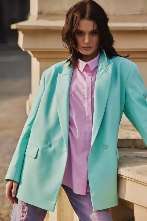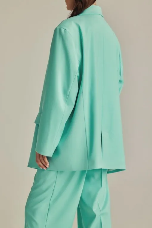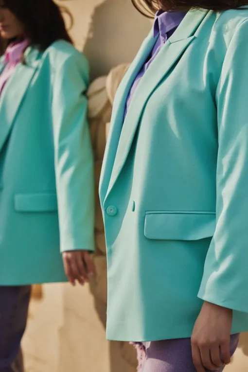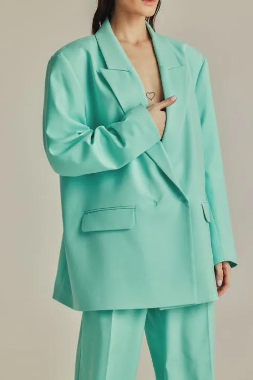 Marynarka uszyta z gładkiej tkaniny w miętowym kolorze. Oversizowy fason, opadająca linia ramienia, sięga do połowy biodra. Duże ostre klapy, zaszywane ręcznie, kieszenie w ramkach z patką. Marynarka zapinana na dwa kryte zatrzaski.