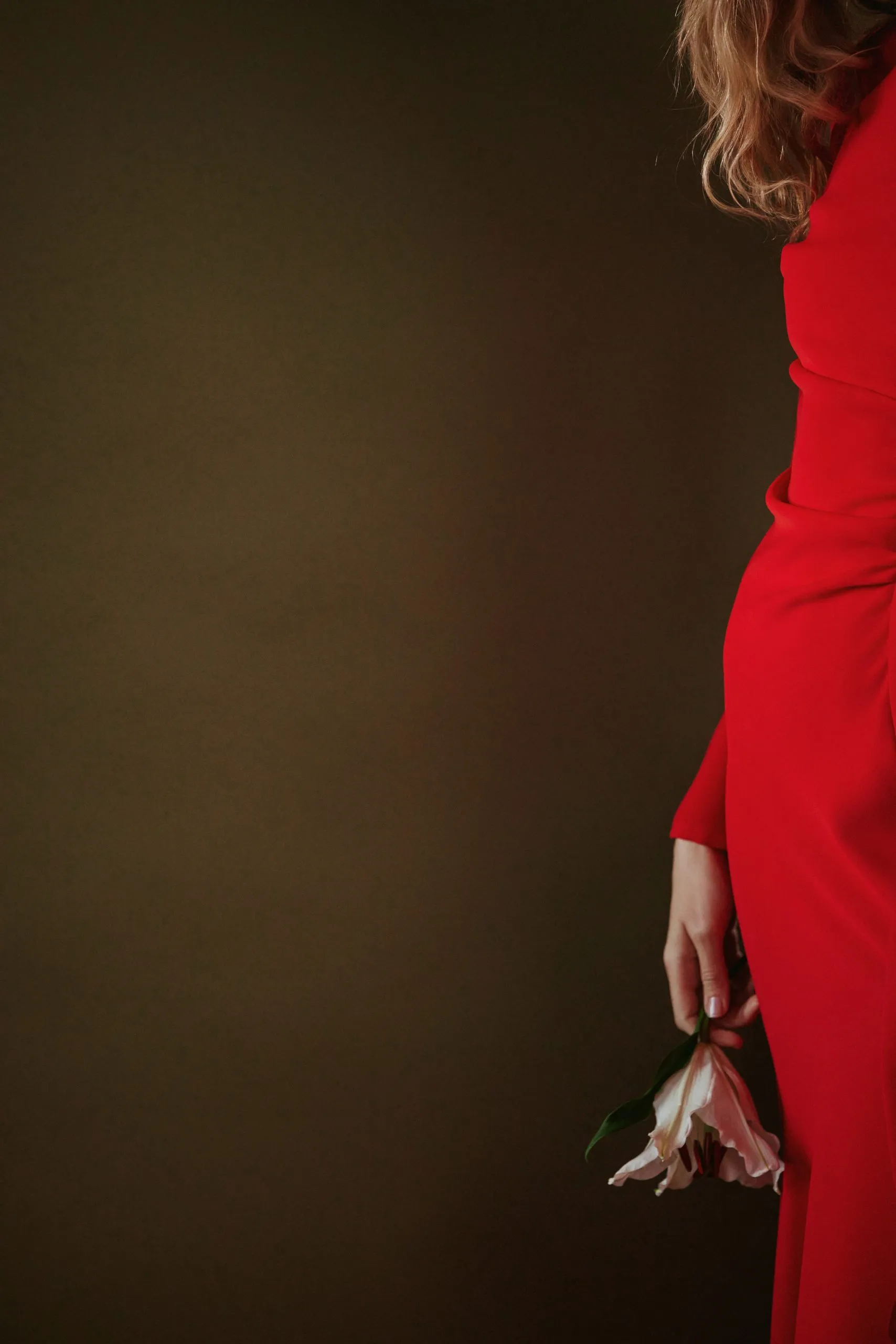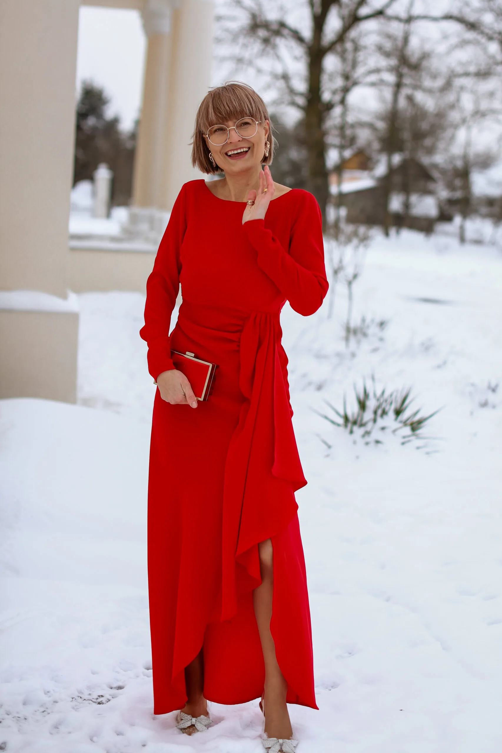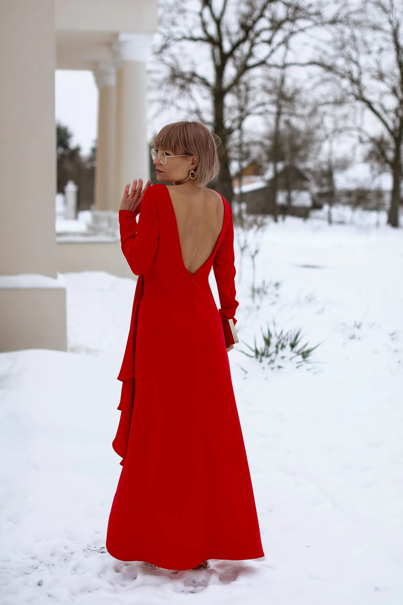 Długa suknia z dekoltem na plecach w kolorze pięknej czerwieni. Płytki dekolt w przodzie. Przód układany w zakładki z pęknięciem eksponującym nogę. Dół sukni zdobi zamaszysta falbana. Tył z głębokim wycięciem. Cała góra odszywana podwójnie, część spódnicowa odszyta wiskozową podszewką. Długi wąski rękaw. Sukienka zapinana na zamek kryty.