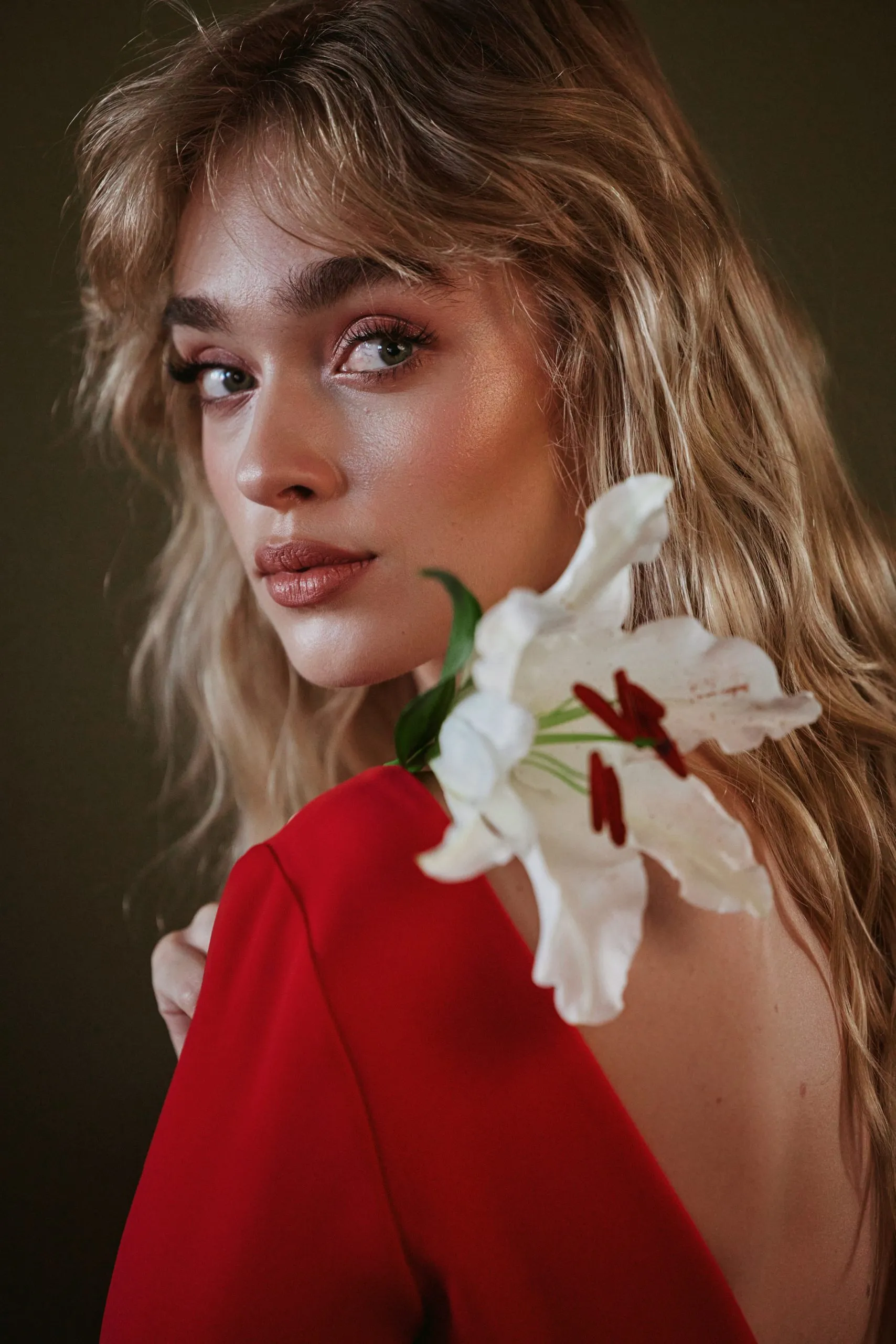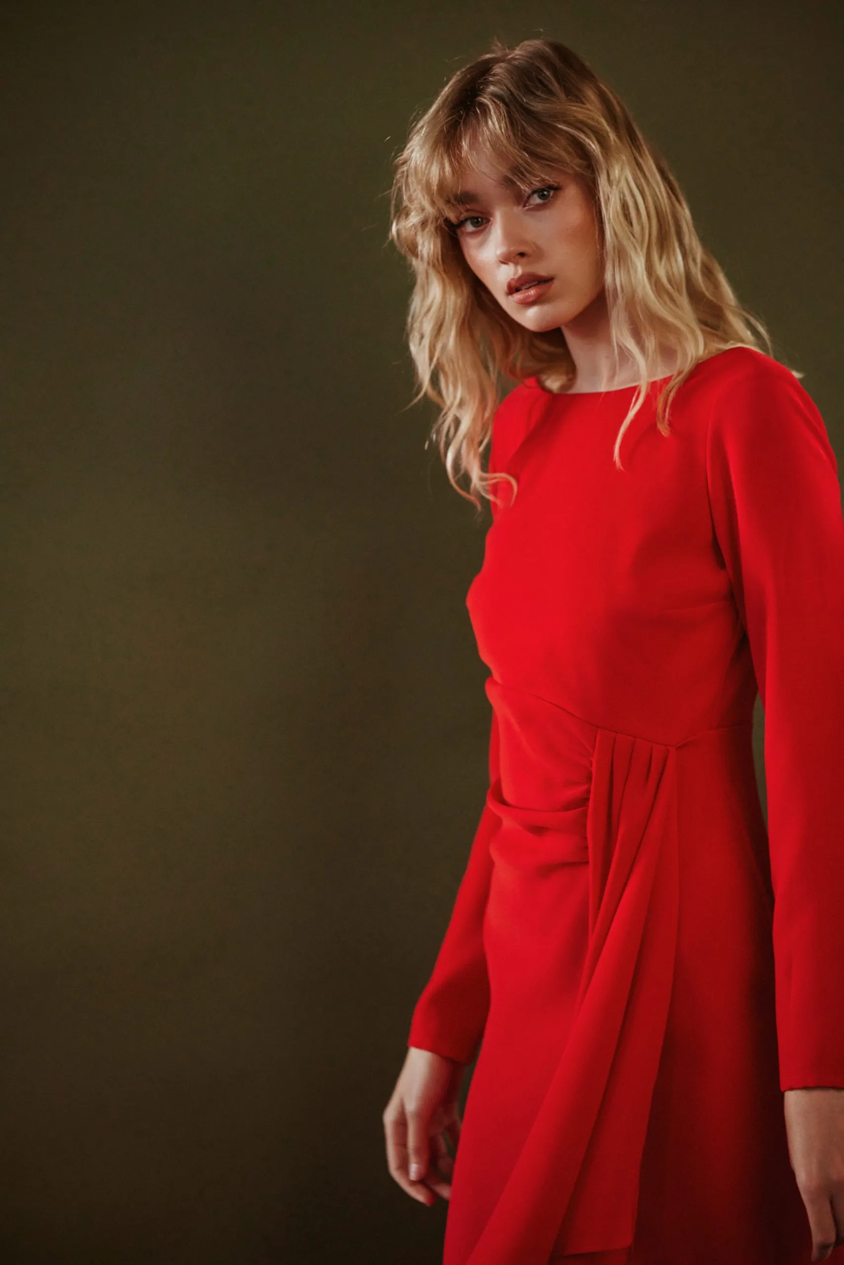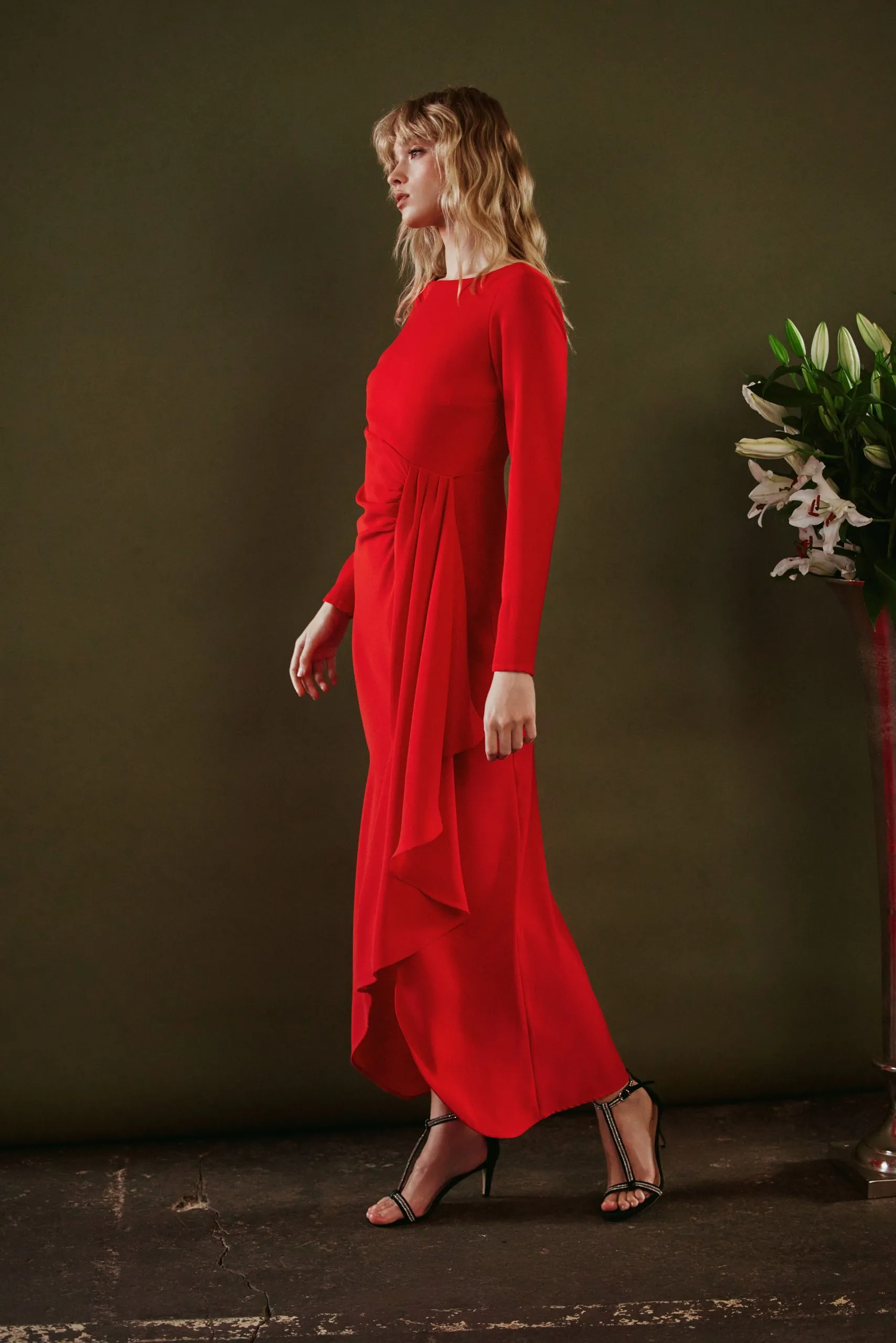 Długa suknia z dekoltem na plecach w kolorze pięknej czerwieni. Płytki dekolt w przodzie. Przód układany w zakładki z pęknięciem eksponującym nogę. Dół sukni zdobi zamaszysta falbana. Tył z głębokim wycięciem. Cała góra odszywana podwójnie, część spódnicowa odszyta wiskozową podszewką. Długi wąski rękaw. Sukienka zapinana na zamek kryty.