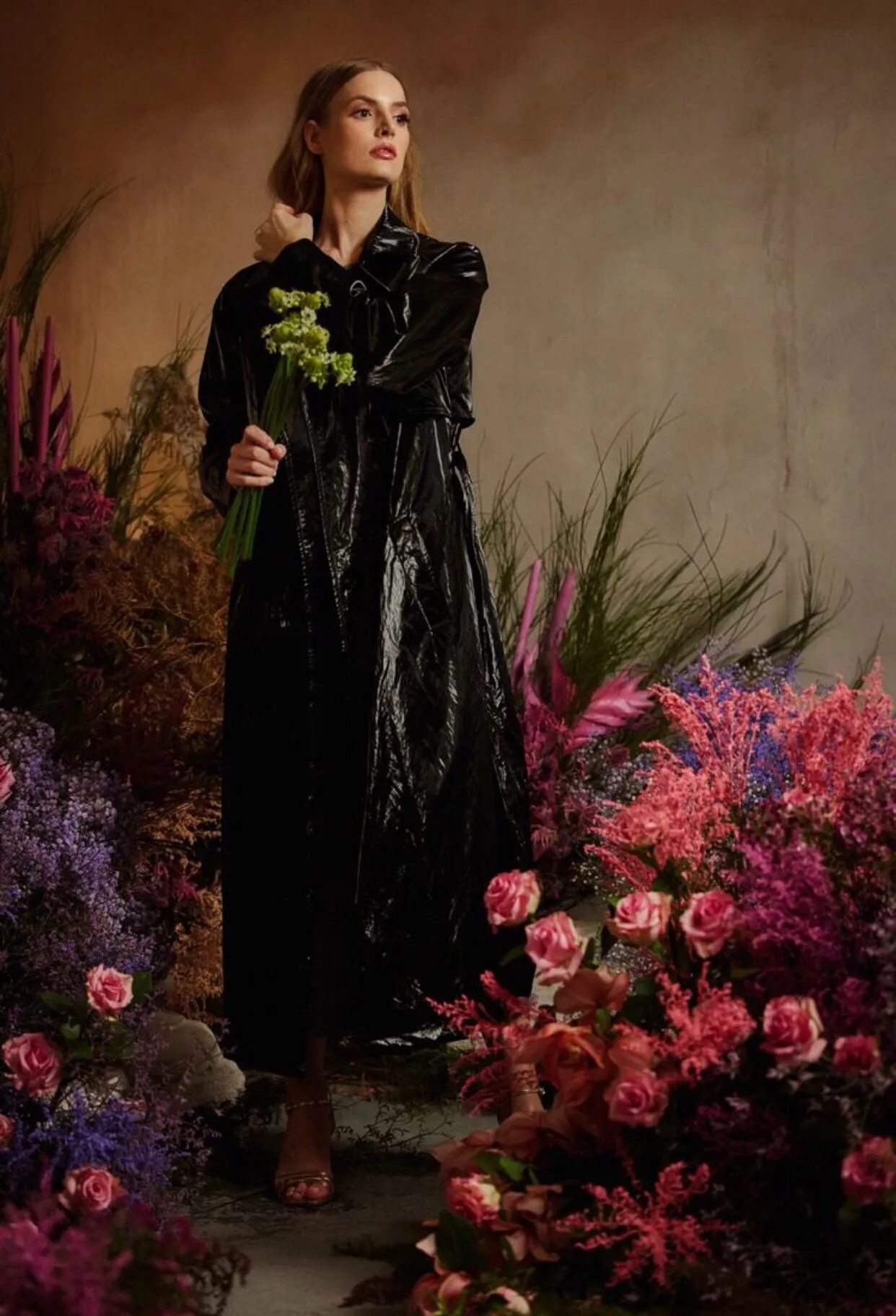 Oversizowy trencz z winylowej tkaniny o niespokojnej strukturze. Z rozporkami po bokach i krótką pelerynką. Z dużymi klapami i kołnierzem. Płaszcz z kieszeniami, bez zapięcia, długości midi. W komplecie pasek. Odszyty wiskozową podszewką.